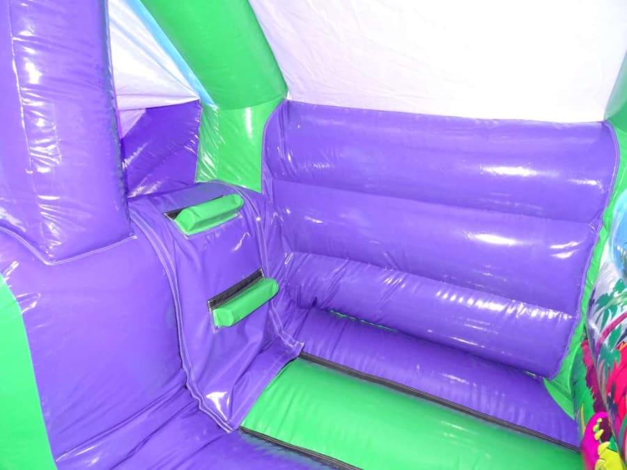 Our Dinosaur themed bouncy castle has a built-in slide (with easy to use steps inside for climbing) and a great area inside to bounce.
