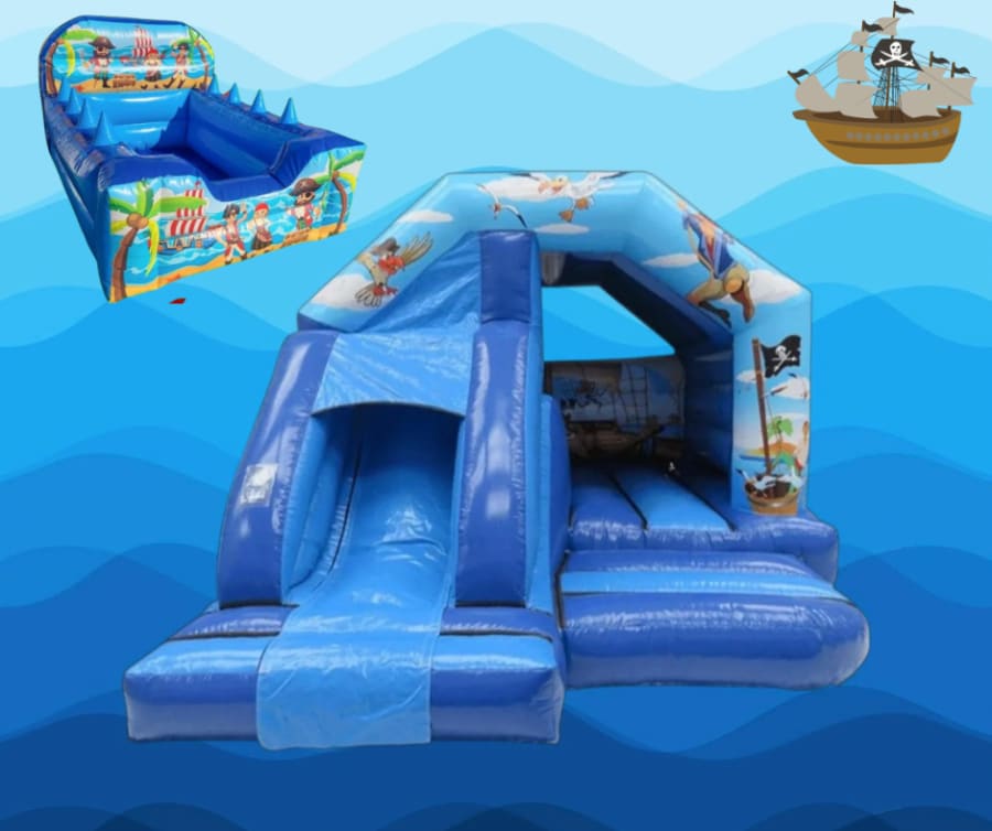 ahoy me hearties! Our Pirates Package features our Pirate Bouncy Castle with slide and ball pit This package is suitable for your very own pirate themed party! Perfect for any future captain of the sea's birthday or celebration.