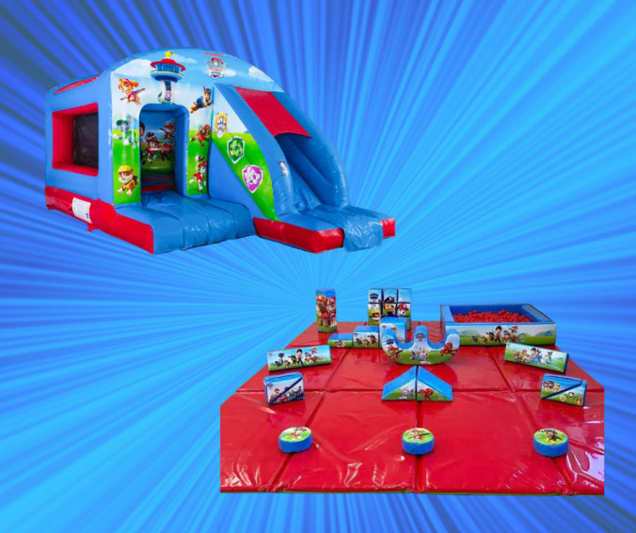 Introducing the Paw Patrol Bouncy Castle with Slide & Soft Play Package, the perfect choice for your little one's Paw Patrol-themed party. This package includes a Paw Patrol-themed bouncy castle with a slide, as well as a Paw Patrol soft play set.